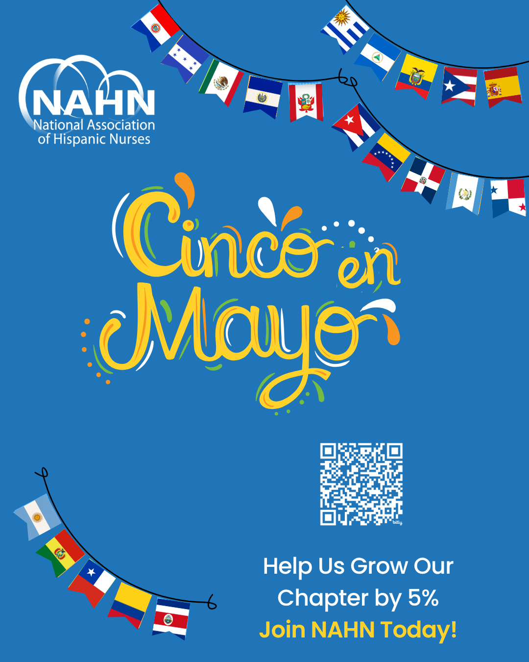• Social Media & Video Reels: Post on your chapter social media accounts multiple times throughout the month of May and include the hashtag #NAHNCincoEnMayo. NAHN National created social media graphics and draft posts for your convenience (linked below). Consider making an Instagram Reel video highlighting what makes your chapter great and introducing some of your chapter members to your audience. Tag @nahn_nursing so that we can share it!